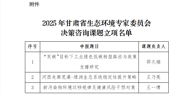 近日,甘肅省生態(tài)環(huán)境廳公布了2025年甘肅省生態(tài)環(huán)境專家委員會決策咨詢課題立項名單。經(jīng)專家組嚴格評審,我單位申報的雙碳目標下工業(yè)綠色低碳轉(zhuǎn)型路徑與政策支撐研究課題獲批立項。